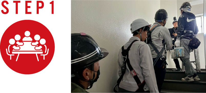 着工前に担当営業・管理・各工種の職人など工事に関わる全てのメンバーを現場に集めて行う着工前打ち合わせを行います。これにより工法や工期、細かな注意事項を共有し、工事のクオリティを上げるだけでなく、コミュニケーション不足によるトラブルを防ぎます。