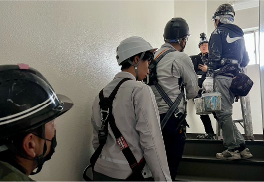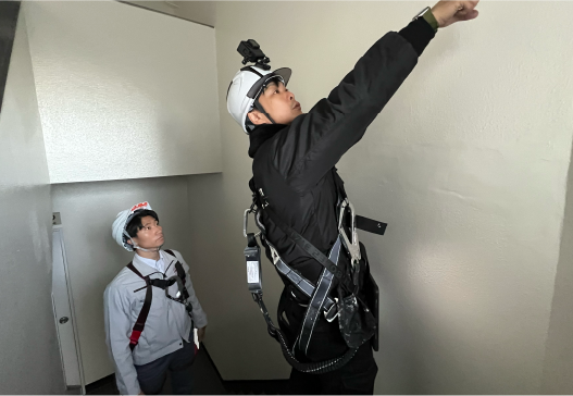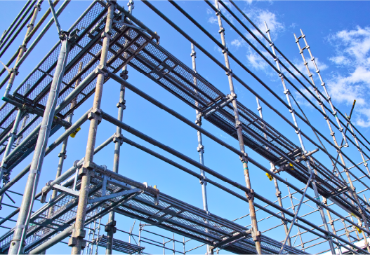 大規模修繕工事で一番最初に始まる工事が足場架設です。最もトラブルが多い工程でもあるので、細心の注意を払います。また、弊社では足場仮設後に安全性、生活導線の確認や各部屋のバルコニーの状態をチェックする足場検査を行います。これにより入居者とのトラブルを事前に防ぎます。