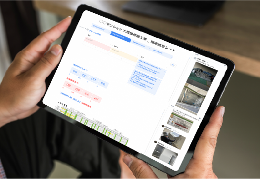 現場の状況をリアルタイムで確認できるWebアプリをお客様へ共有いたします。いつでも好きな時に工事の進捗状況や作業の写真などをご覧いただくことができます。専用iPadの無料貸し出しも行っております。