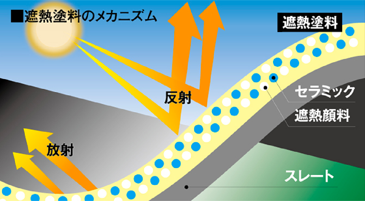 太陽光の波長のうち温度上昇に関わる近赤外線を、遮熱塗料に含まれるナノセラミック粒子が効果的に反射することで屋内への熱の侵入を防ぎます。